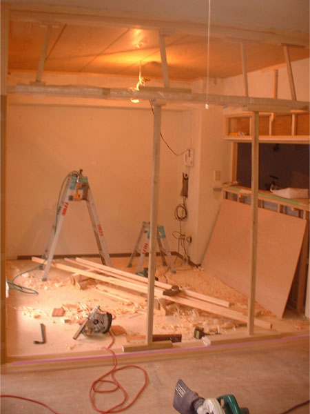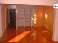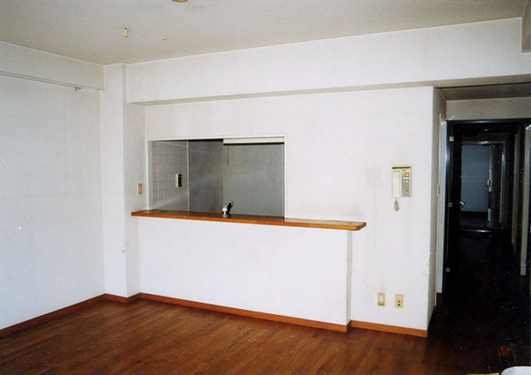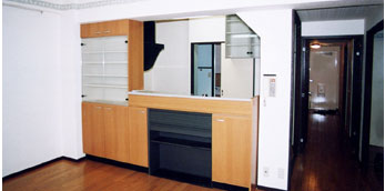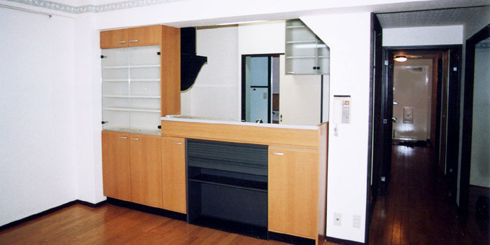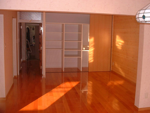 リビングには、かば桜というほのかに桜色の混じった床材を使用し 温かみが出ました。マンションでは、防音の規定があるため、クッションのついた合板の床材を 通常使うのですが、クッションの付いた足を何箇所も立てその上に厚めのボードを敷 くことで、無垢の床材を敷く事を可能にしました。 また、使い勝手も悪い奥まった和室を解体しリビングスペースに しました。