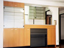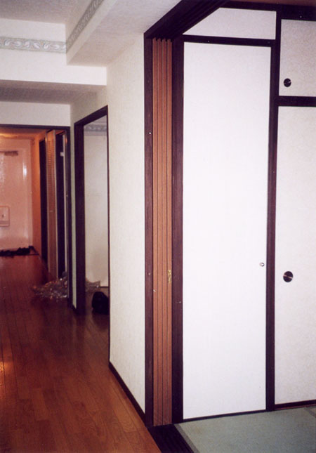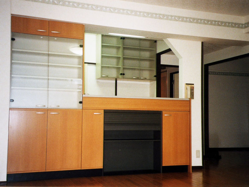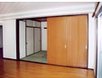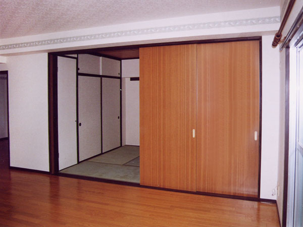 広々リビングを実現するために、隣接する和室の仕切り壁を出来るだけなくしました。来客時に個室として使えるように4枚の引き戸を取り付け、以前物入れだった部分を扉の収納庫に改造し、普段はここに収納出来るようにしました。和室もリビングも明るさと広さの両方を実現できました。