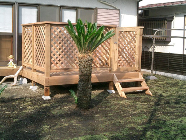 庭木でいっぱいだった広い庭を将来子供が生まれたら遊べるように思い切って庭木を処分しました。ウッドデッキと自転車置き場を施工。芝も植えて和風のイメージから南国風のイメージに変身。