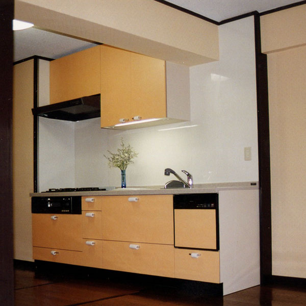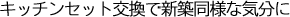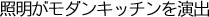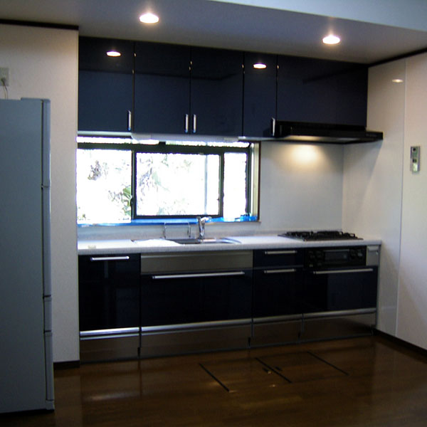 キッチンをより広くするためにキッチンセット分の増築をしました。もともとあった構造上の出っ張り部分の下り壁を逆に利用して、ダウンライトをつけることでアクセントがつき、モダンで明るいキッチンに生まれ変わりました。